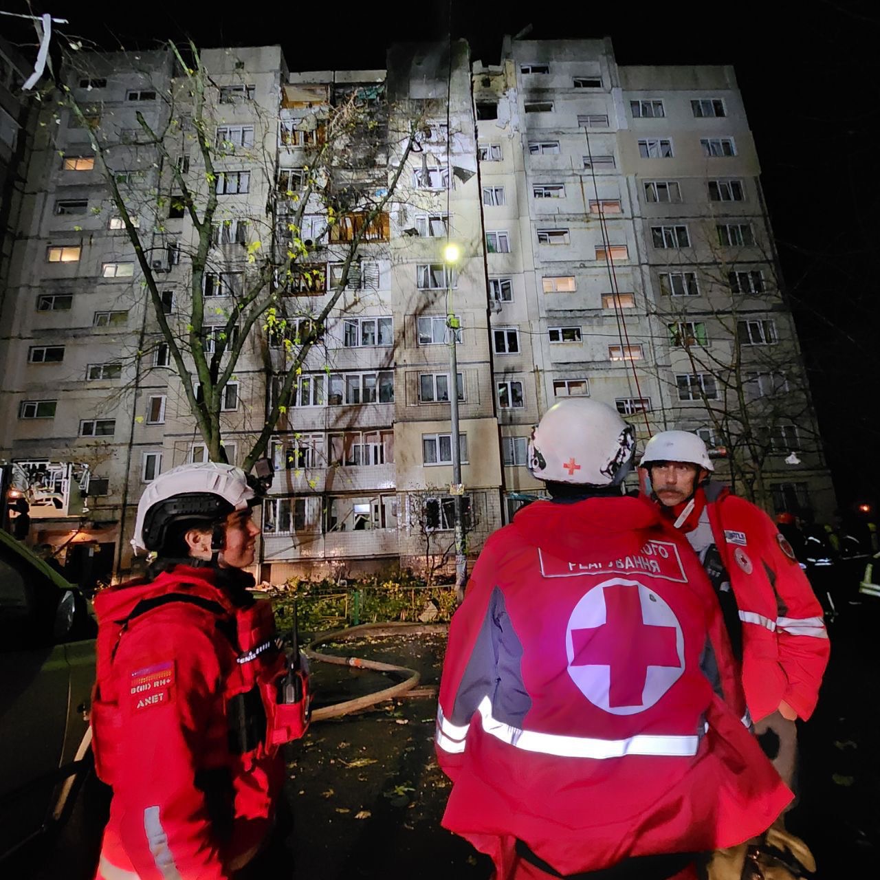 Ukrainian Red Cross assistance points are currently operating at the sites of the strikes. Volunteers are distributing hot drinks to residents of damaged buildings and to emergency responders involved in dealing with the aftermath of the attack. First aid and psychological first aid are also available when needed.