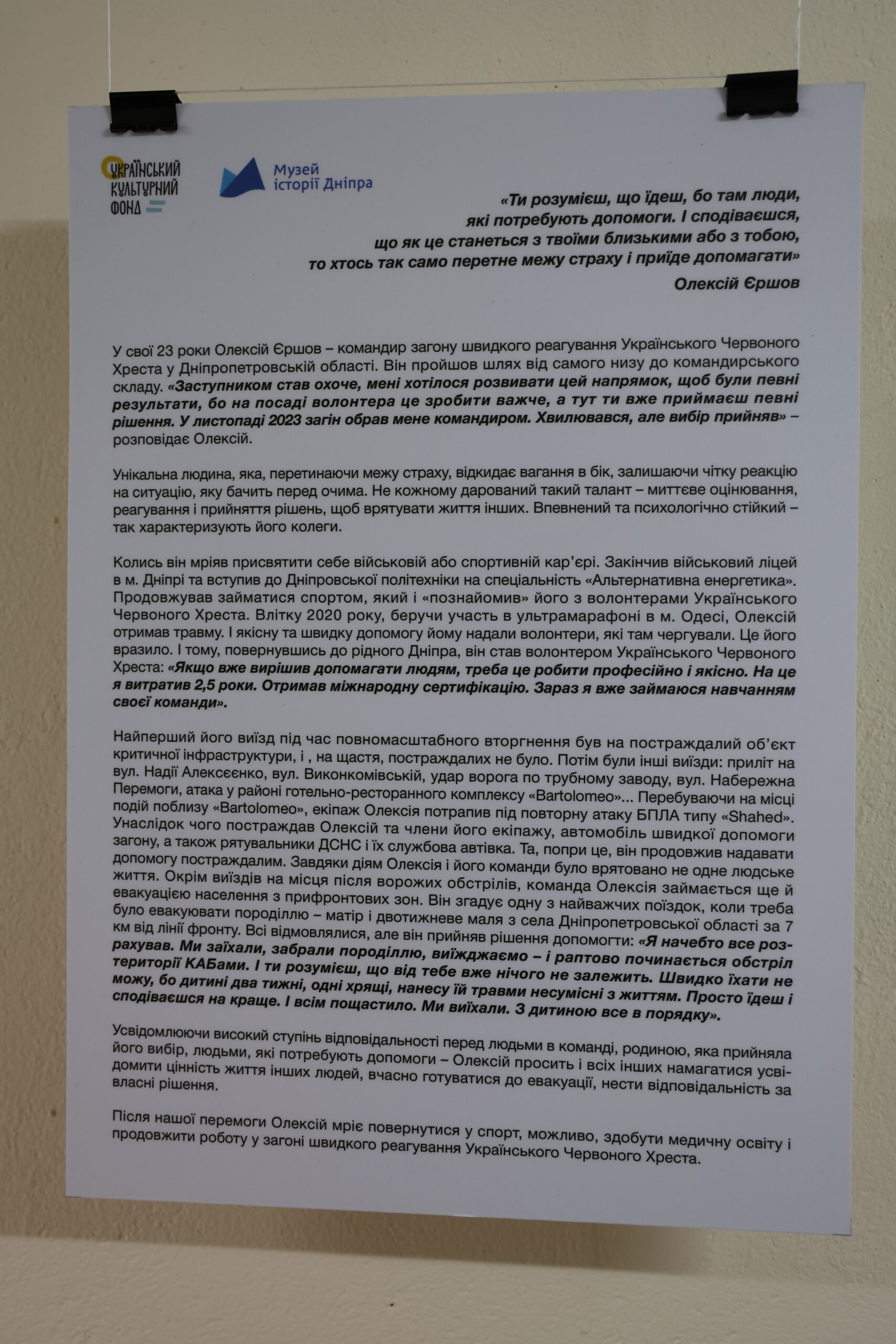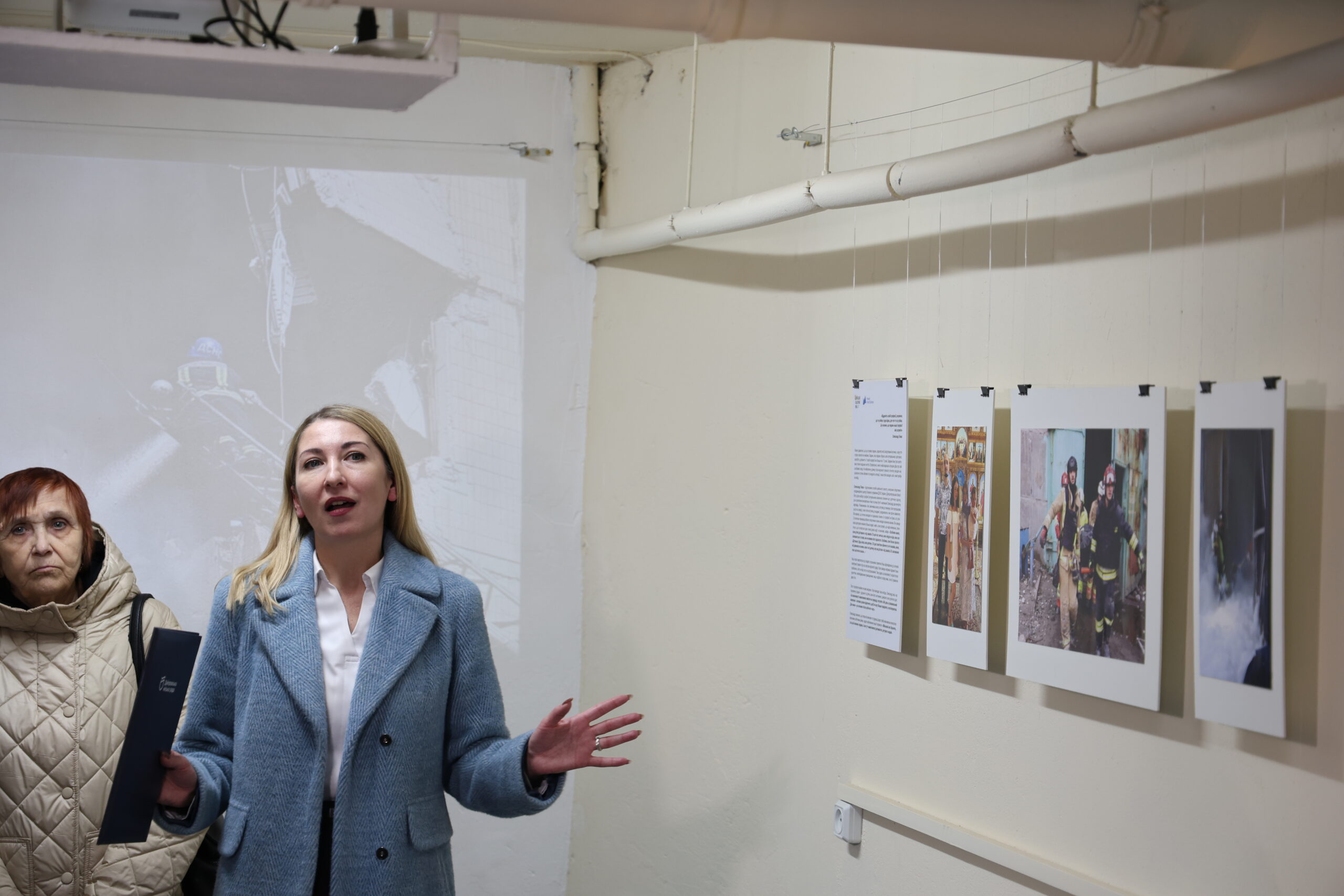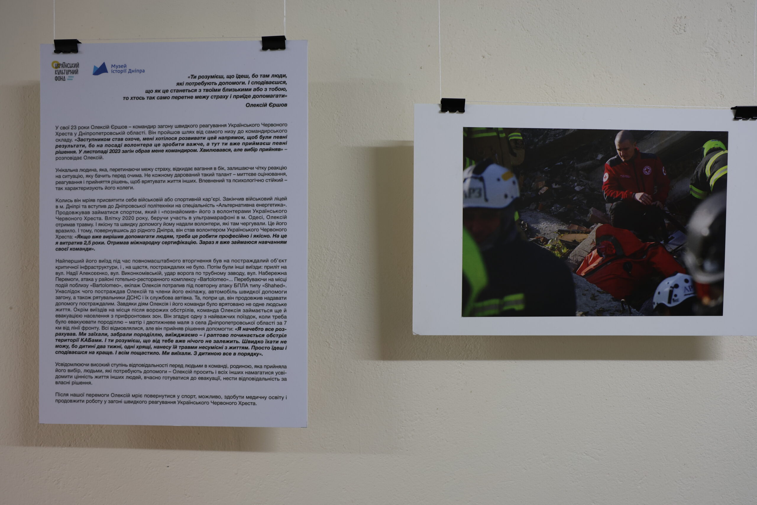 The exhibition space features photographs, personal stories, and video reports about those who lost their lives while performing their duties, as well as those who continue to support and rebuild Dnipro today.