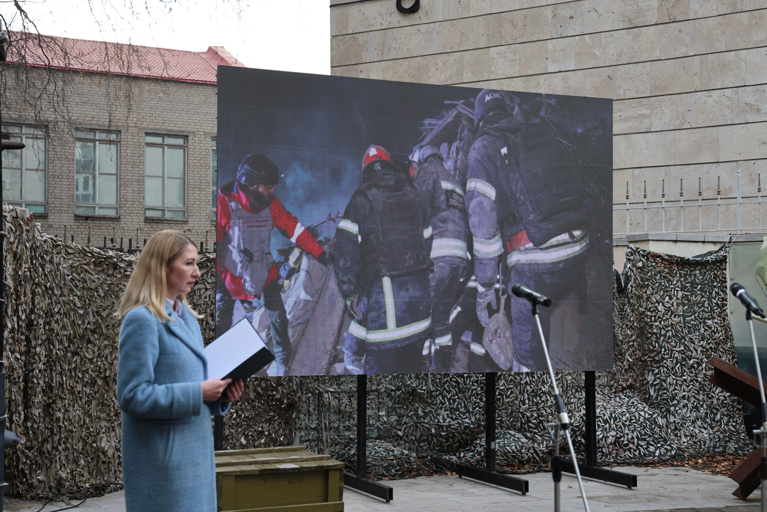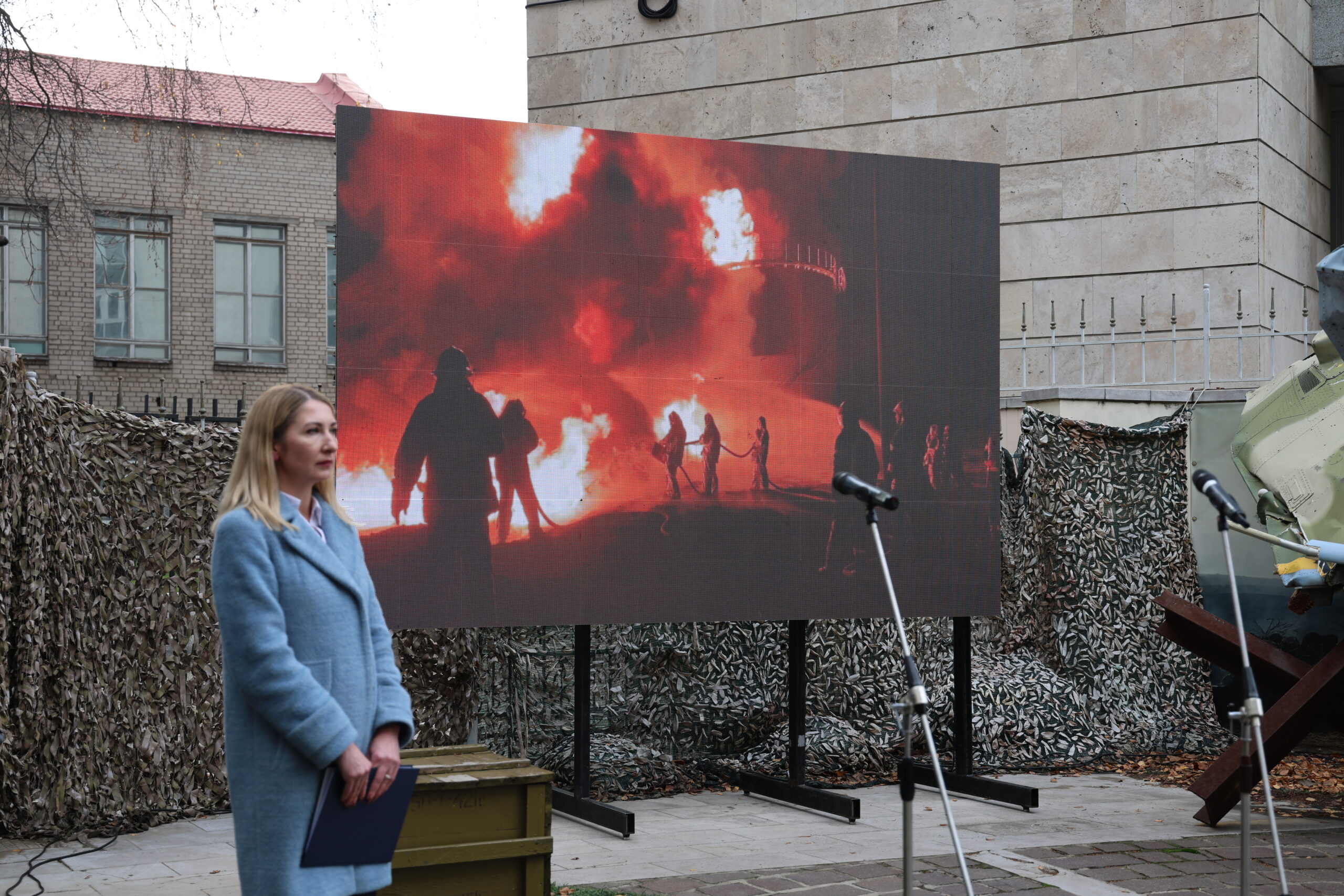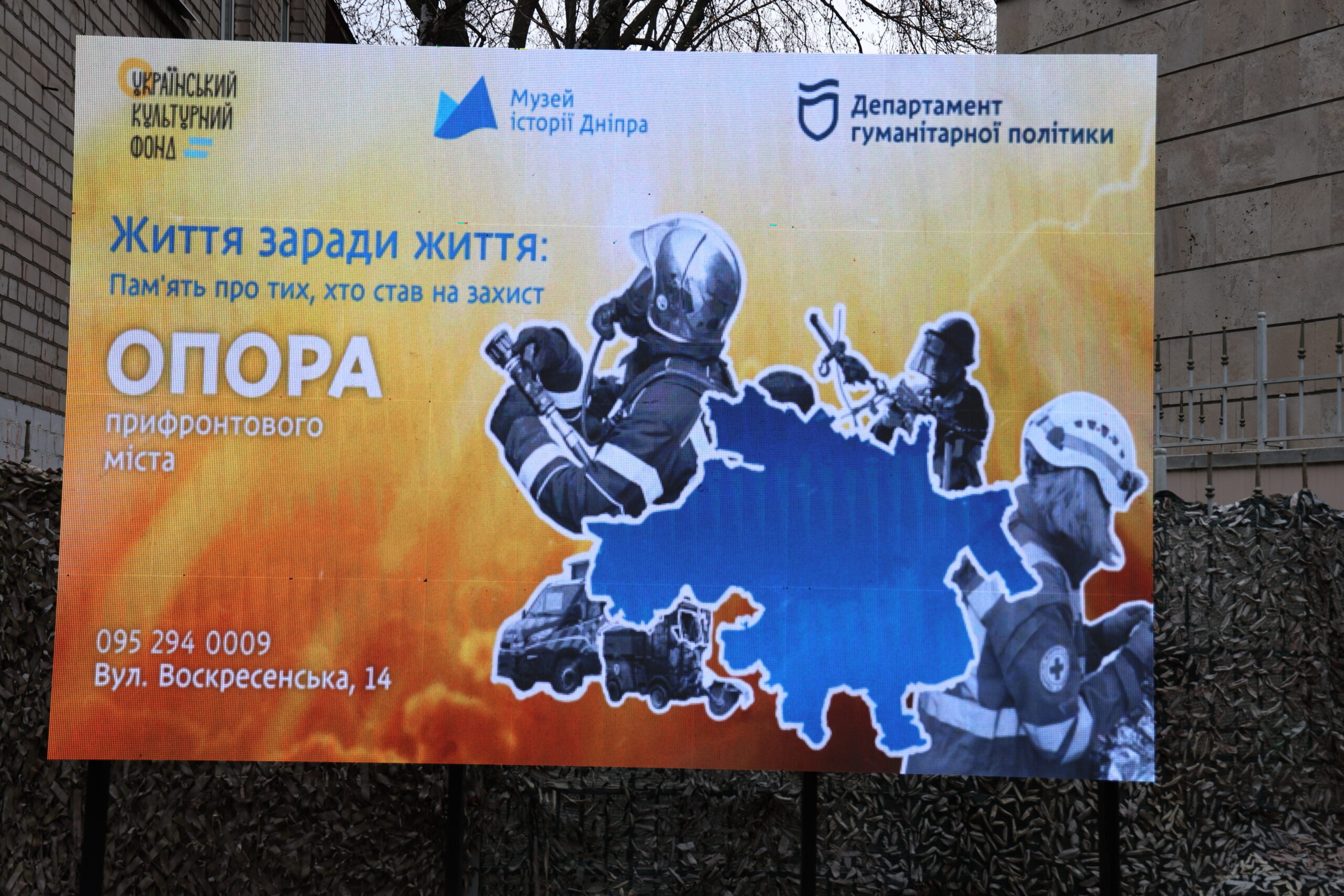The exhibition space features photographs, personal stories, and video reports about those who lost their lives while performing their duties, as well as those who continue to support and rebuild Dnipro today.