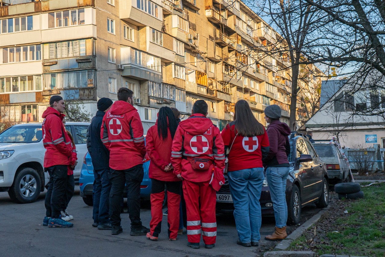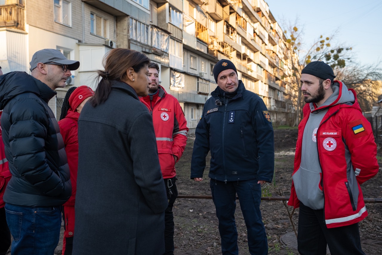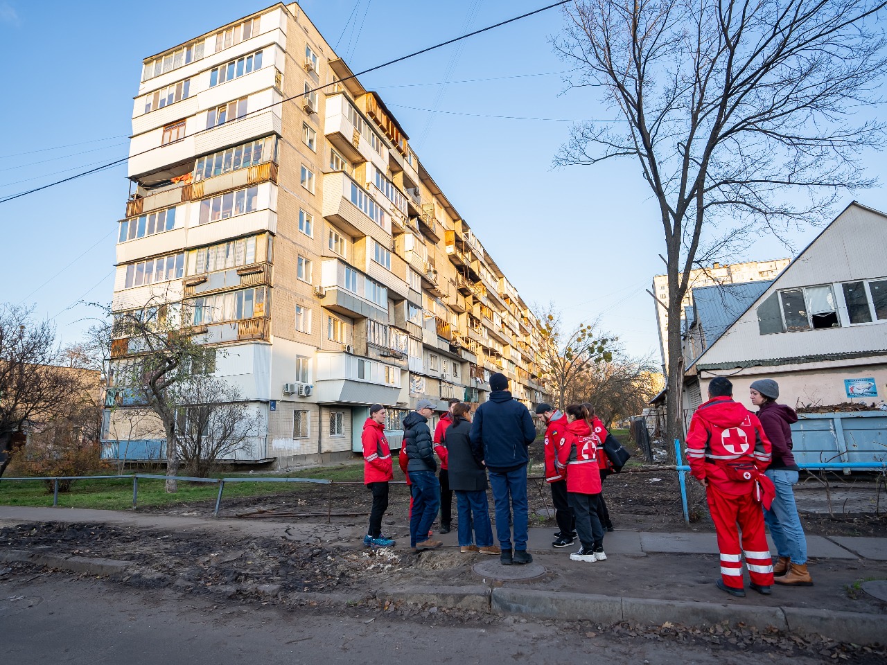 Representatives of the British Red Cross also witnessed first-hand the destruction caused by strikes in Kyiv and Chernihiv. At the site of a recent strike on residential buildings in the capital, the delegation met with the Ukrainian Red Cross emergency response team, which had been involved in rescue operations, as well as with the Deputy Head of the State Emergency Service of Ukraine in Kyiv. The discussions focused on coordination and collaboration during emergency responses to strikes and other incidents.