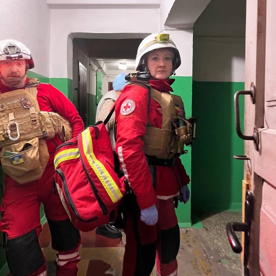 In Kyiv, the emergency response team from the National Committee of the Ukrainian Red Cross provided assistance at four locations. Volunteers delivered first aid to seven injured people, while another seven received psychological first aid. One person was evacuated from a damaged residential building using a fire ladder in a joint operation with the State Emergency Service of Ukraine and the Kyiv Rescue Service. Our volunteers also supported the evacuation of a resident from a damaged block of flats in the Darnytskyi district.