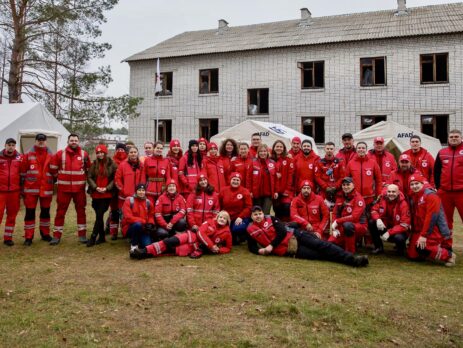 Зранку поруч із закинутою, на перший погляд, будівлею біля річки в Київській області гамірно і багатолюдно. Тут зібралися кілька десятків людей у впізнаваній в усьому світі червоно-білій формі. Це волонтери Українського Червоного Хреста, які з’їхалися з різних регіонів України, щоб разом пройти навчання – відпрацювати навички, які потрібні в їхній роботі щодня. Особливо необхідними ці вміння стали під час повномасштабної війни в Україні.