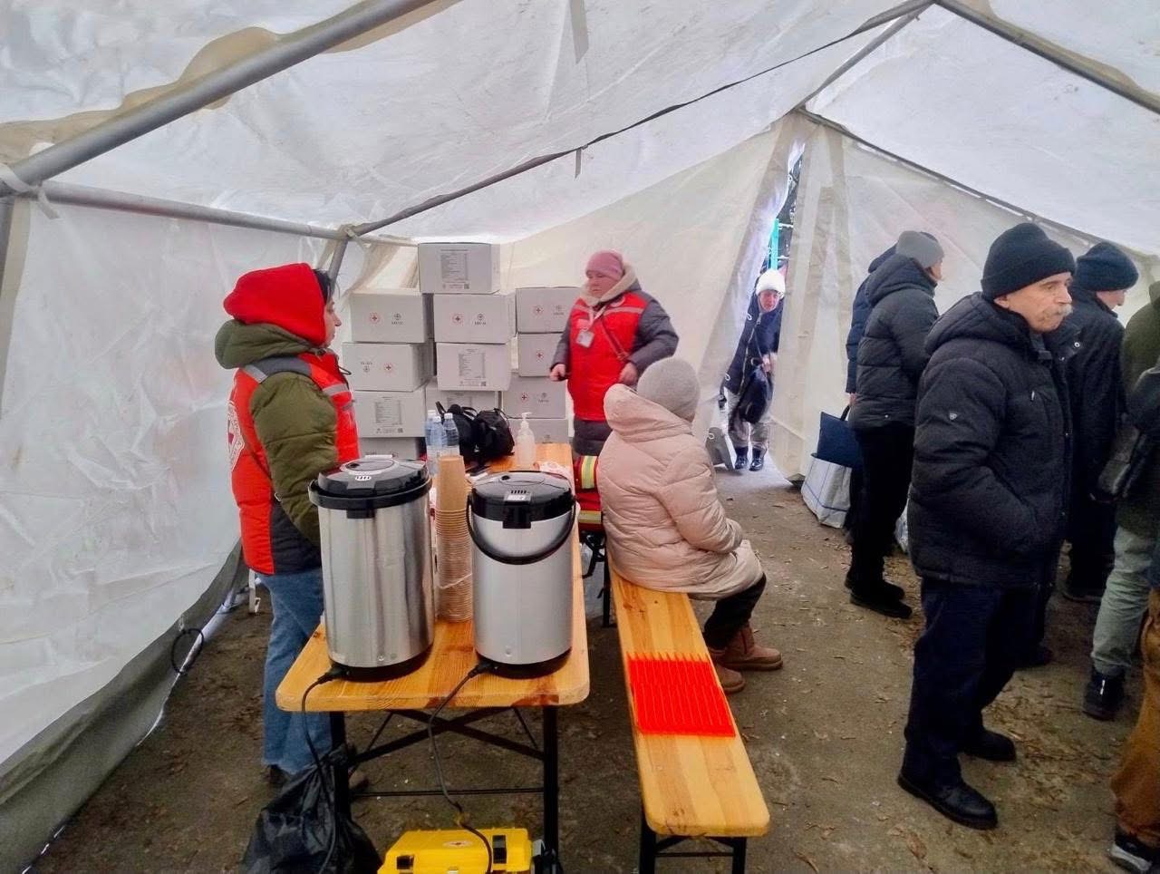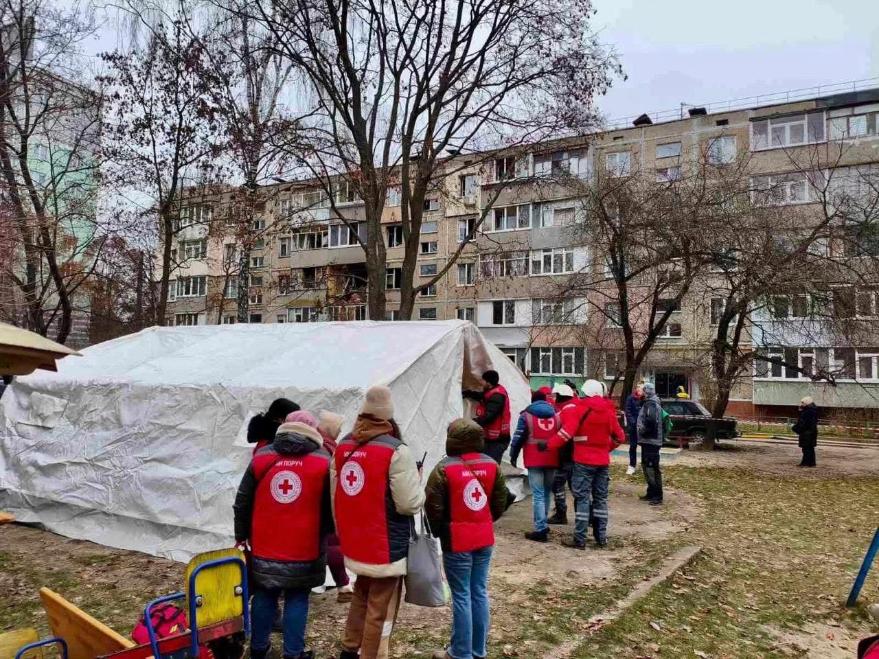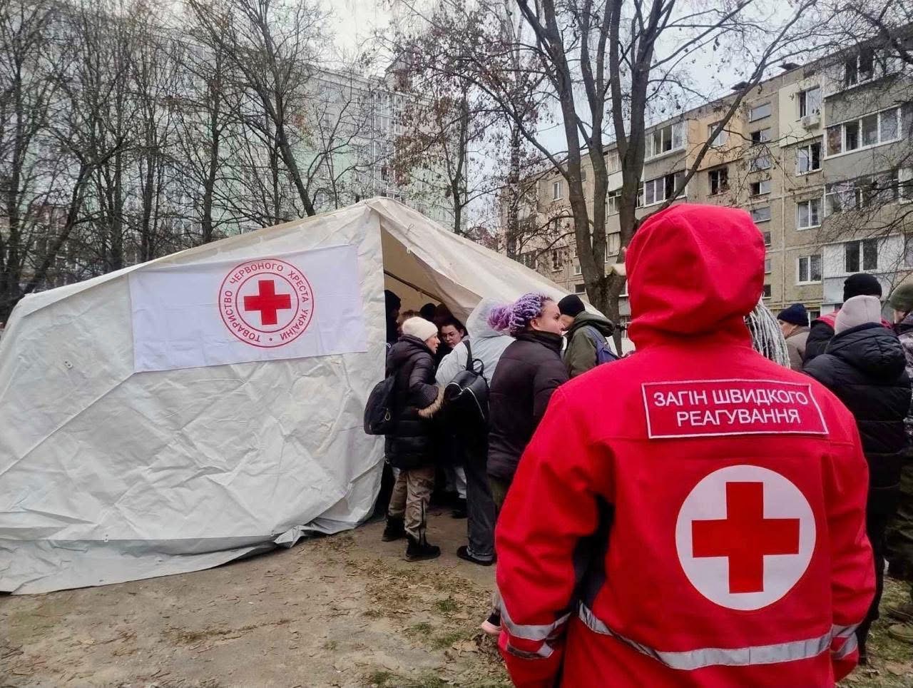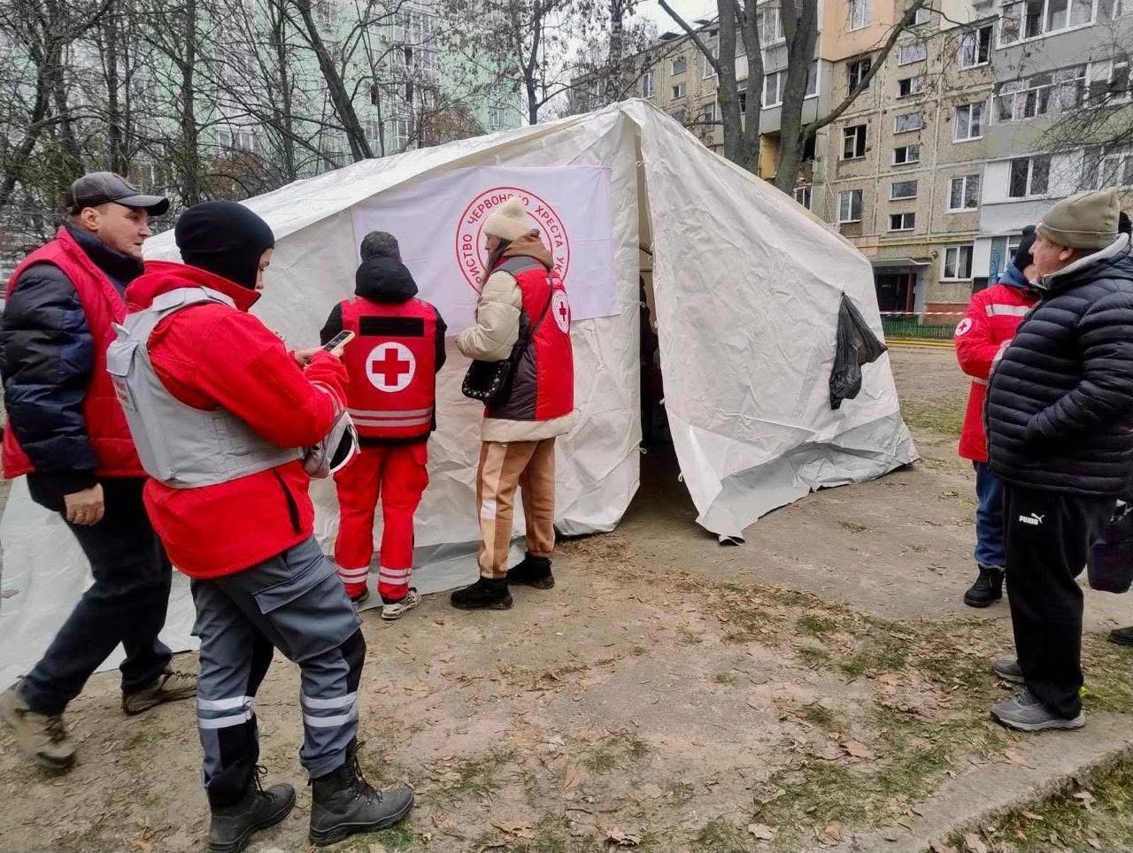 Так, волонтери розгорнули пункт допомоги Українського Червоного Хреста, де мешканці пошкодженого будинку можуть зігрітися, отримати першу допомогу та психологічну підтримку. Також мешканцям будинку видаються набори для надзвичайних ситуацій, OSB-плити та брезенти для тимчасового ремонту пошкоджених осель.