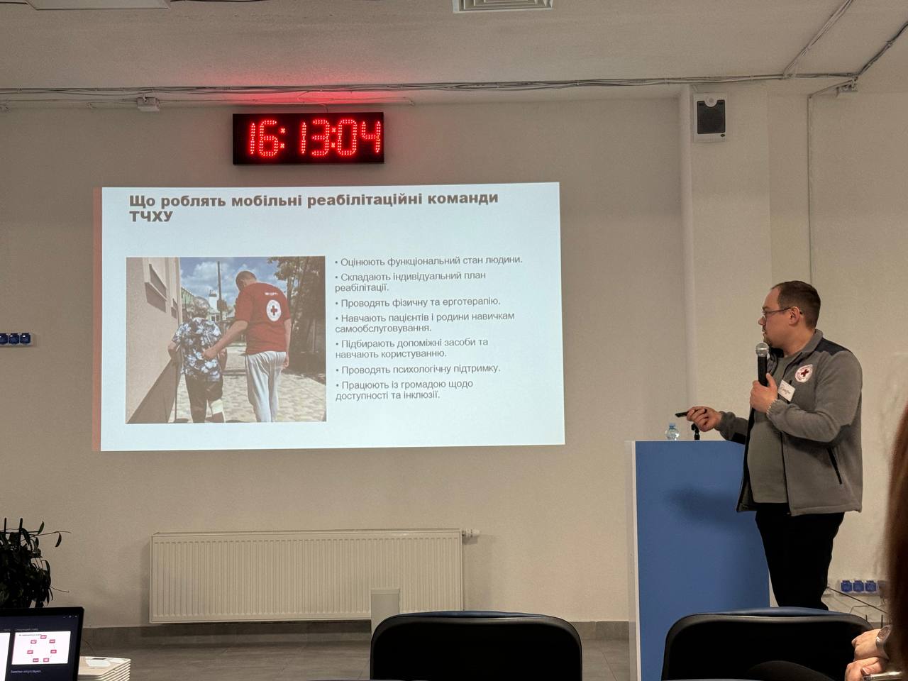 Учасники ознайомилися із сучасними підходами до реабілітації та практичними аспектами відновлення після інсульту, уражень спинного мозку, ампутацій і травм нижніх кінцівок. Одним зі спікерів став тренер мобільної реабілітаційної команди Українського Червоного Хреста, який виступив із доповіддю на тему «Реабілітація в громаді» та поділився практичним досвідом роботи з пацієнтами поза стаціонаром.