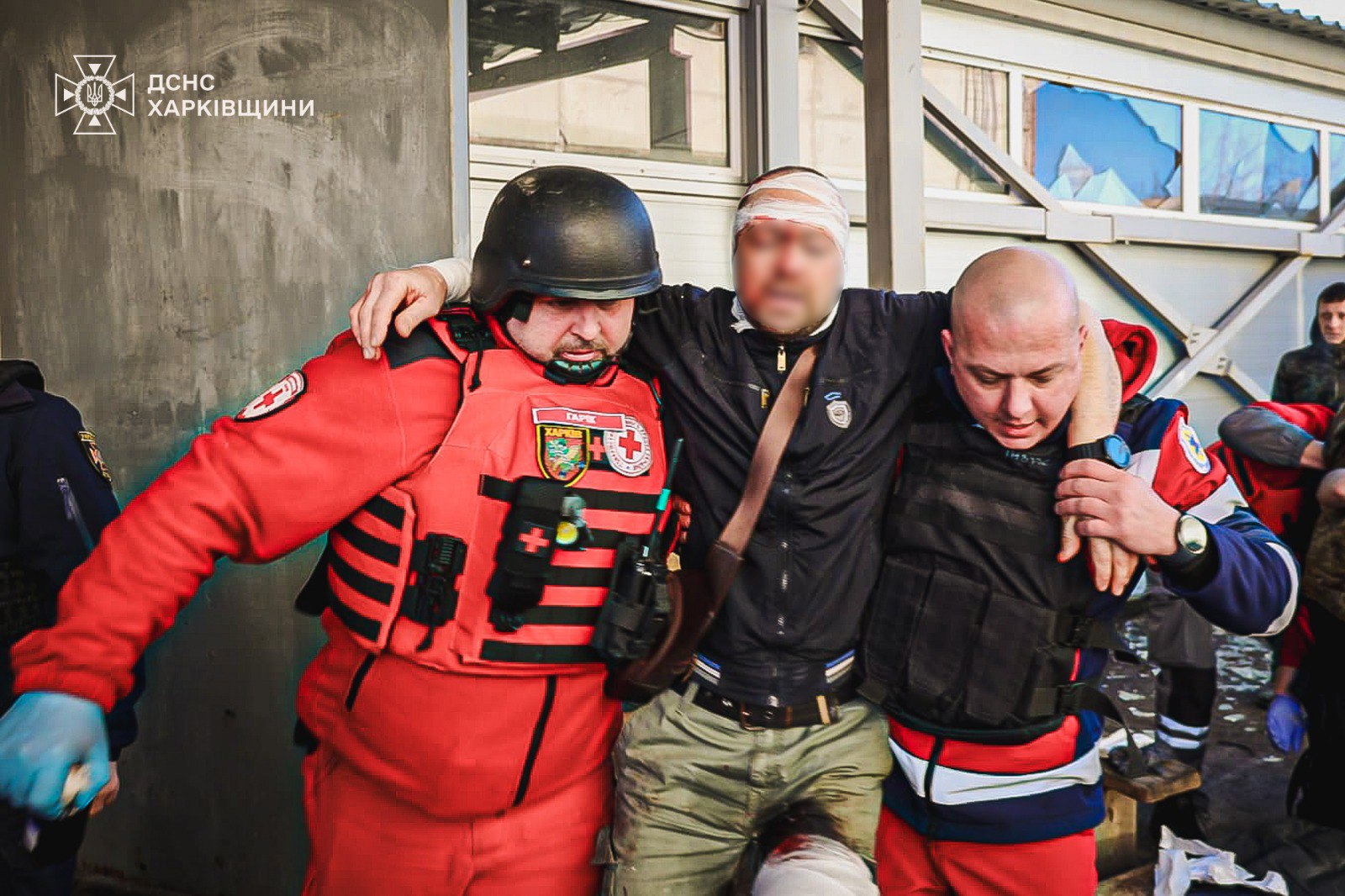 Загін швидкого реагування Українського Червоного Хреста у Харківській області спільно з іншими рятувальними службами проводили поквартирний обхід пошкоджених будинків для виявлення постраждалих, надавали першу допомогу та передавали поранених «швидким», надавали першу психологічну допомогу постраждалим.