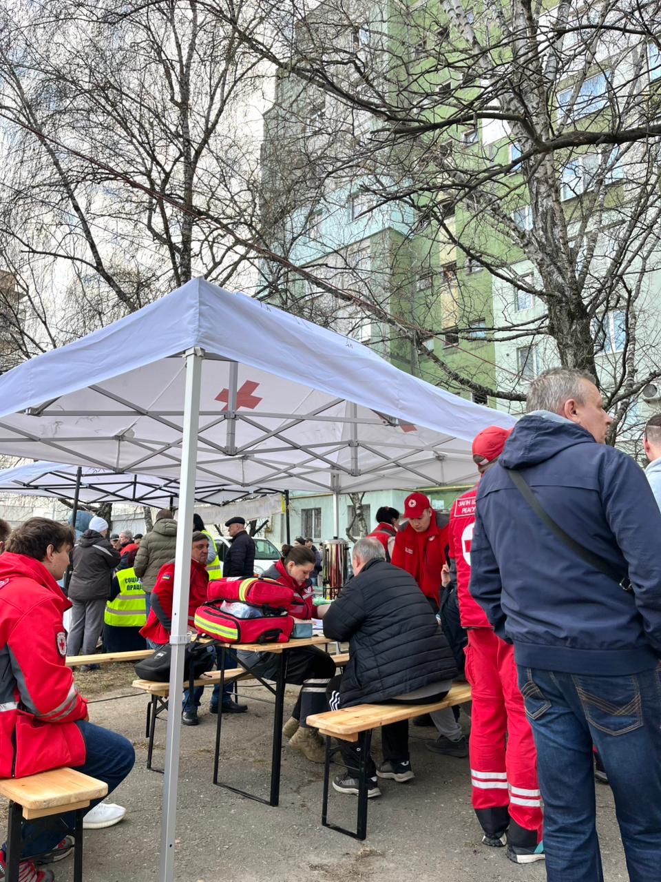 Наразі розгорнуто намет допомоги. Тут видають людям, чиє житло постраждало від атаки, матеріали для тимчасового перекриття пошкоджень. Також у наметі можна отримати від фахівців першу допомогу та першу психологічну допомогу; відпочити, зігрітися та випити теплого чаю.