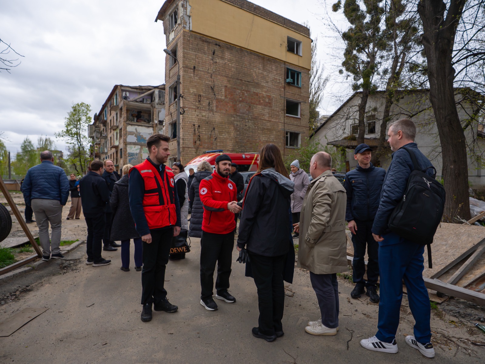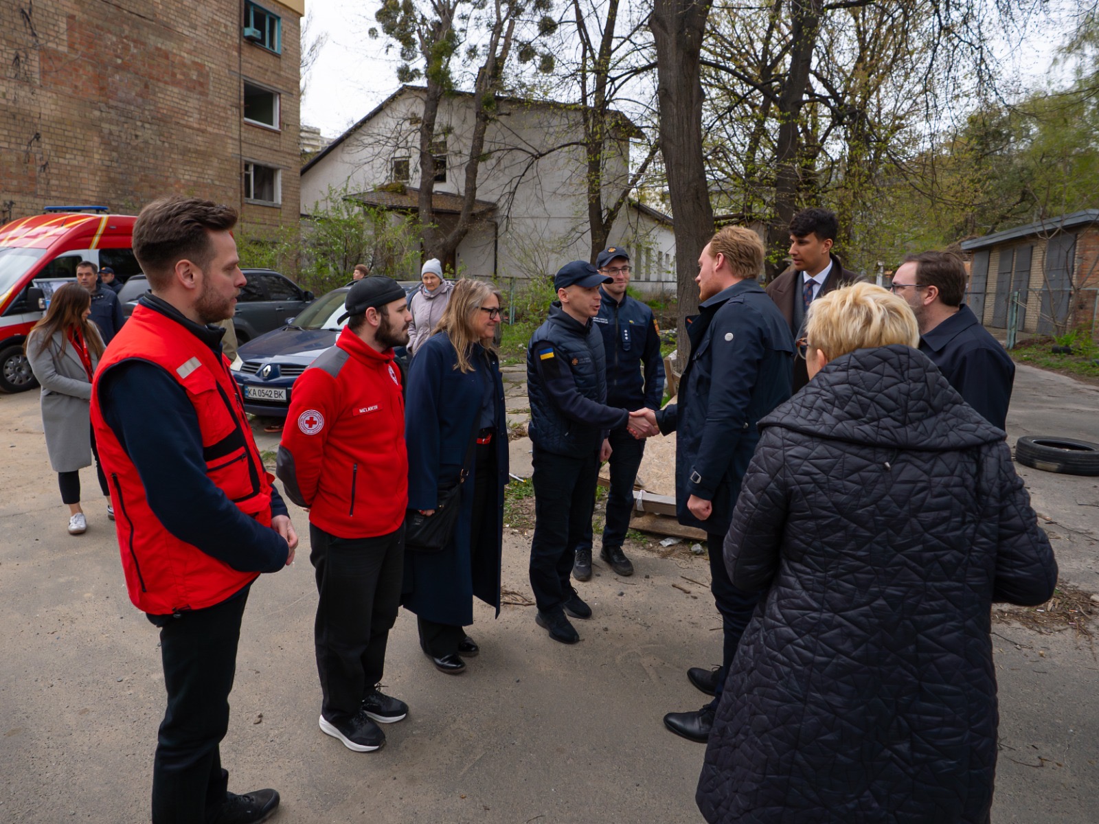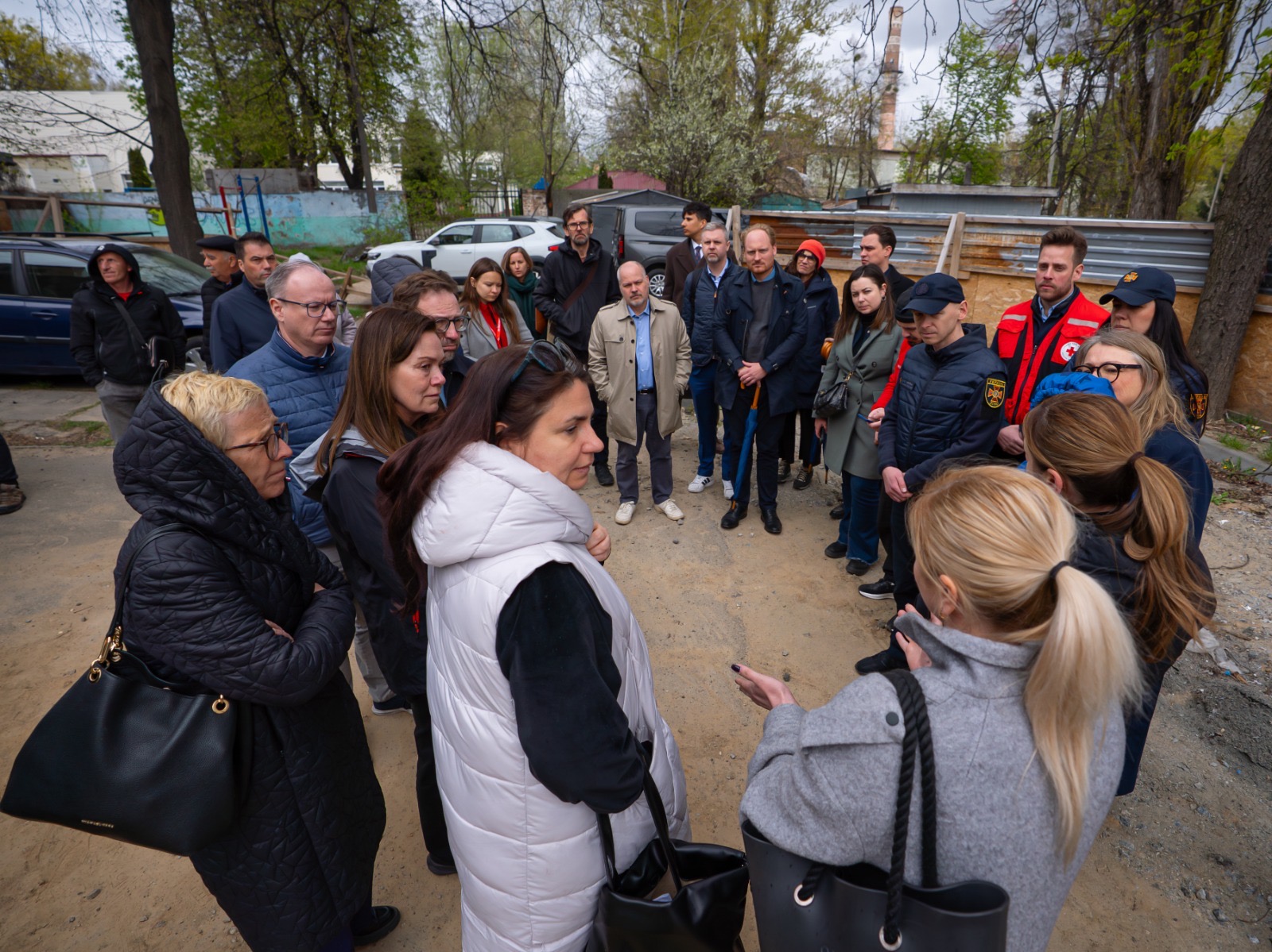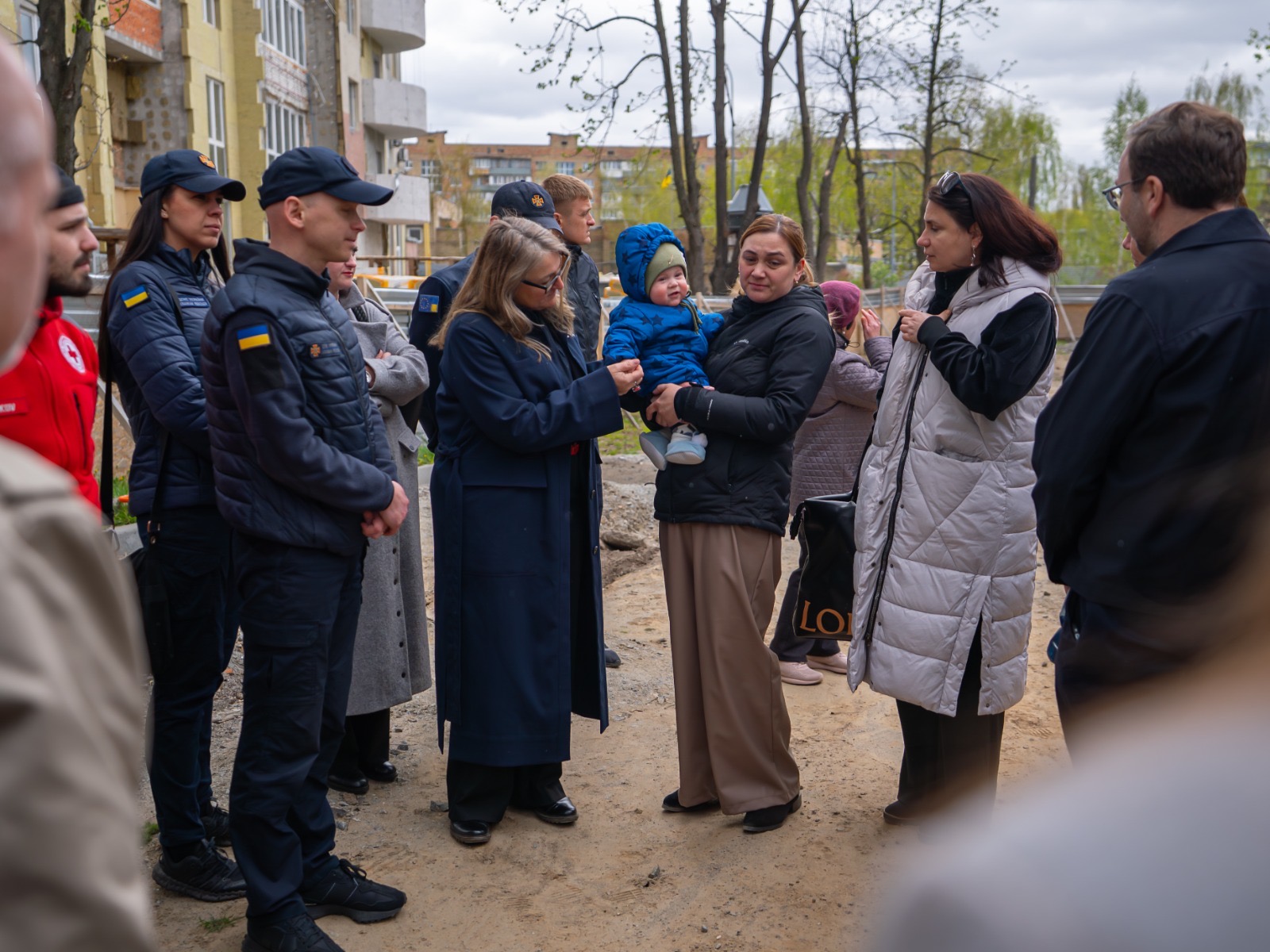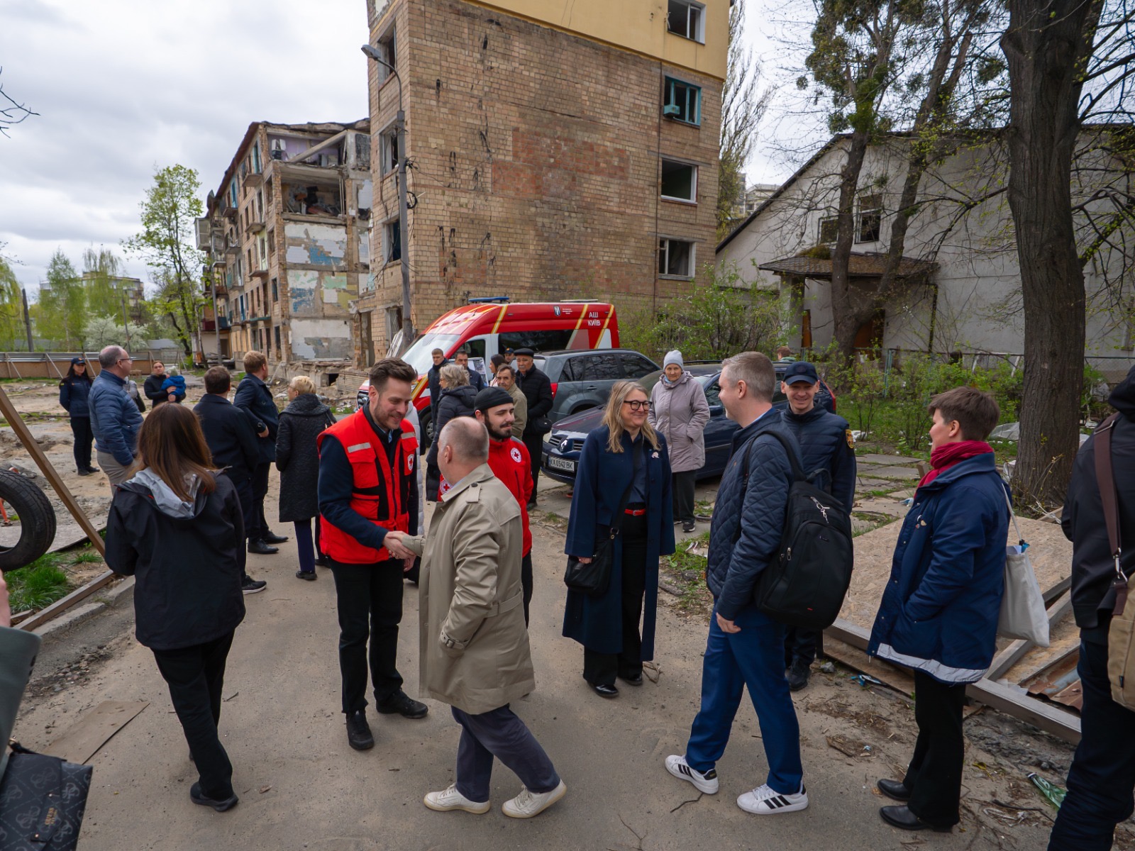 Також делегація відвідала локацію з пошкодженим житловим будинком, де поспілкувалася з мешканцями, які постраждали внаслідок обстрілу. Люди поділилися власними історіями та спогадами про одну з наймасованіших атак на Київ, а також досвідом отримання допомоги після неї. Серед них — жінка з немовлям, яка на момент влучання була вагітною та була врятована під час рятувальної операції.